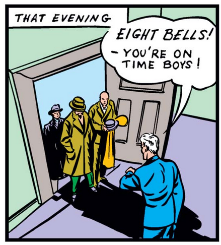 ...and absolutely none of that has any bearing on this! You wake with a start in your tent, you are Hannibal crossing the alps etc. In 1939, with the absence of a dime still keenly felt in our pocket, all we know about this bunch is what we were told on the previous panel - that these are the Scientists' Guild representatives, and that one of them apparently wears two overcoats. And check that nightmarish perspective! The long shadows! We're back in horror movie mode for this - these are the villagers coming to see the monster. They're not carrying burning torches, but they might as well be. More of that in coming weeks, as we inch closer still to the actual meat.
